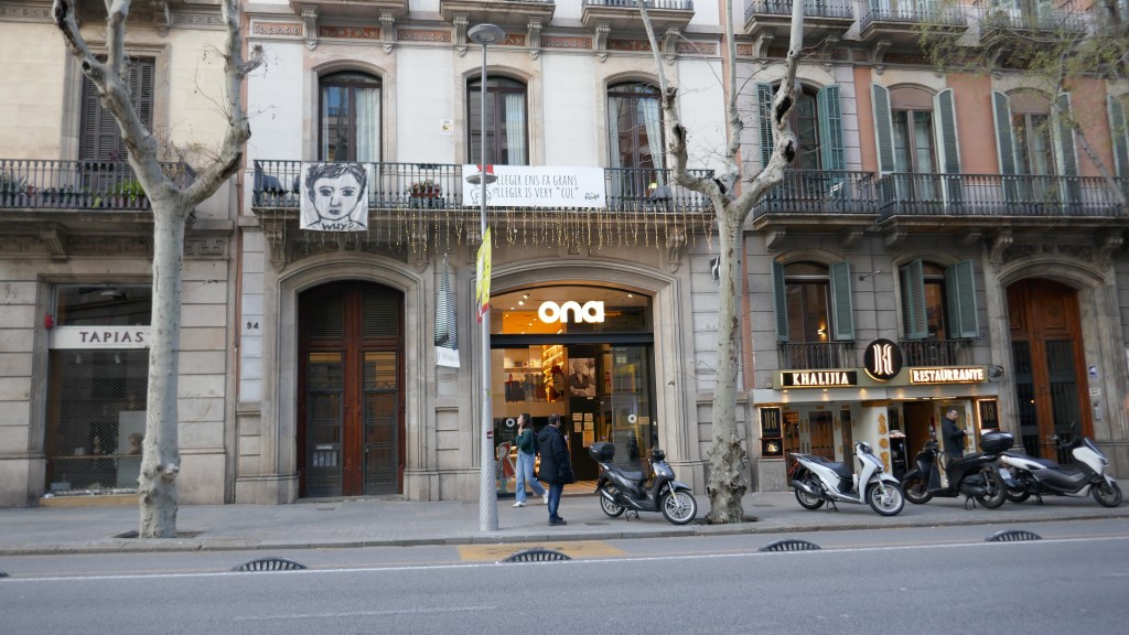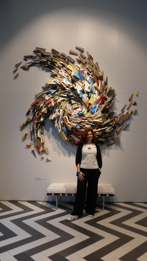 Además, en la entrada puede verse esta obra de arte que semeja una ola (ona en catalán) hecha de libros: